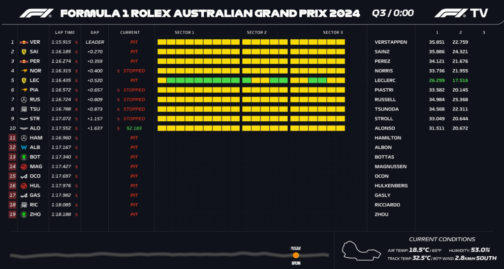 Saturday is Free Practice 3 and Qualifying. This last practice session allows teams to make any final changes and review their data. Later, the qualifying session begins. The following image is derived from this year’s Australian Grand Prix qualifying session on F1TV.