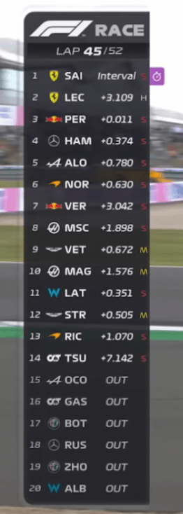This is the sidebar. Let’s go left to right. The numbers represent a driver’s position on the track. The icons next to the number is the logo of the team a driver is driving for. The three letters following that represent the first three letters of a driver’s last name. This section with the times either show “interval” or “leader”. Interval shows the time between the driver and the driver one place above them. When it says leader, it shows the time between each driver and the race leader. The monograms S, M, or H display the type of tire the driver is currently on. Lastly, the pink icon next to the driver on the far right is awarded to the driver with the fastest lap time.