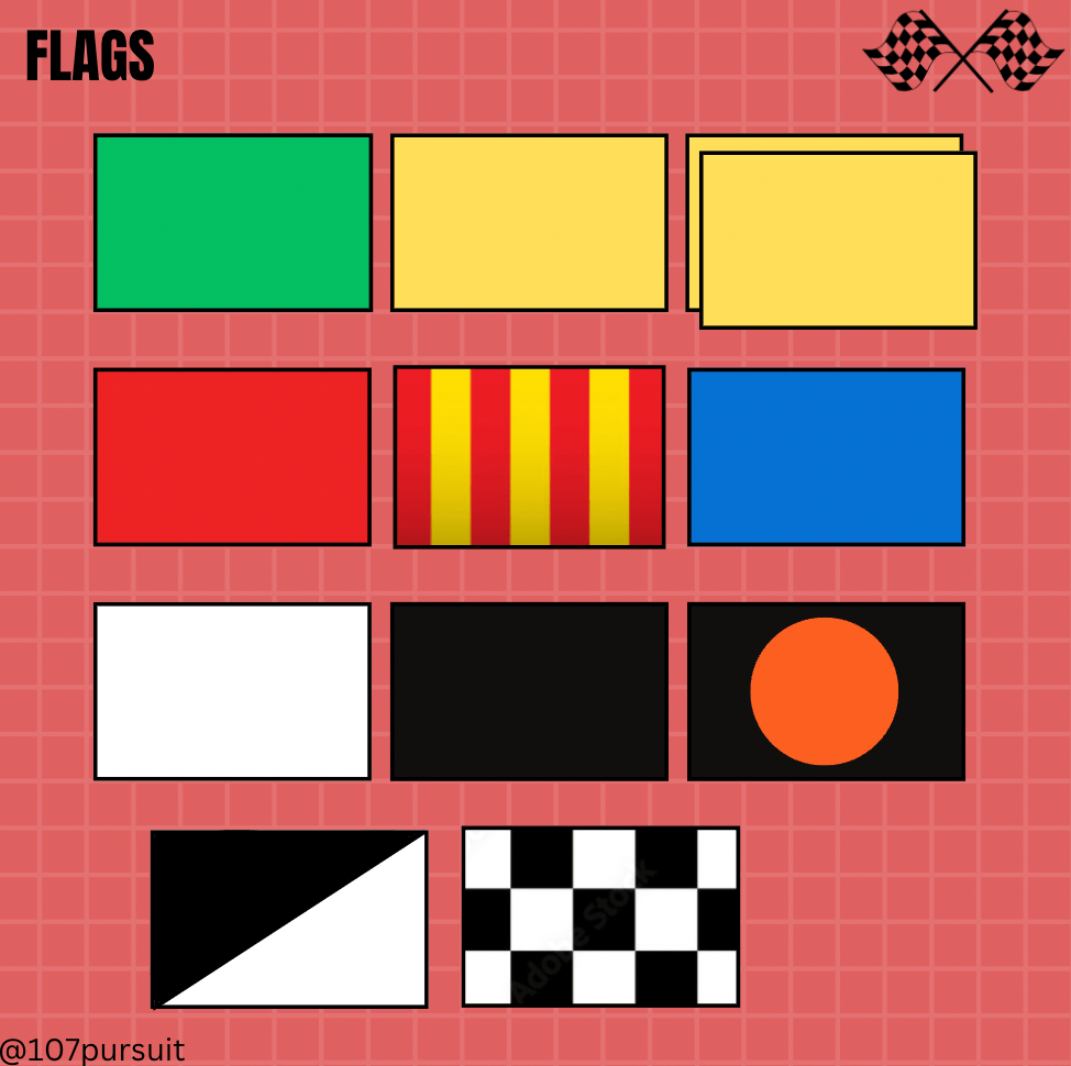 There is a handful of flags used during a race. While not all of them are used, they each have their own meaning.