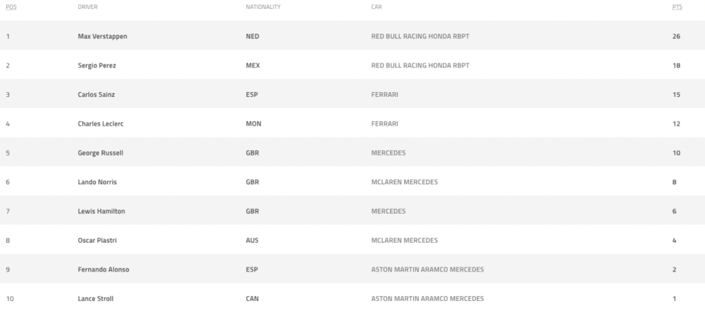 Once the race has ended, only the top 10 drivers are awarded points. Each point they are given is shown below. A driver is awarded an additional point for getting the fastest lap as seen with Max Verstappen for this race.
