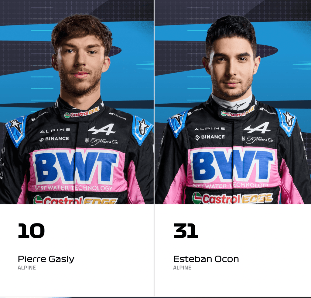 Alpine. Their team principal is Bruno Famin with Pierre Gasly and Esteban Ocon as drivers. This team uses a Renault power unit.