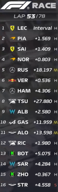 Throughout the race, Piastri and Leclerc engage in pace battles with Leclerc controlling the race pace and subsequent pressure from Piastri needing to pick up speed.